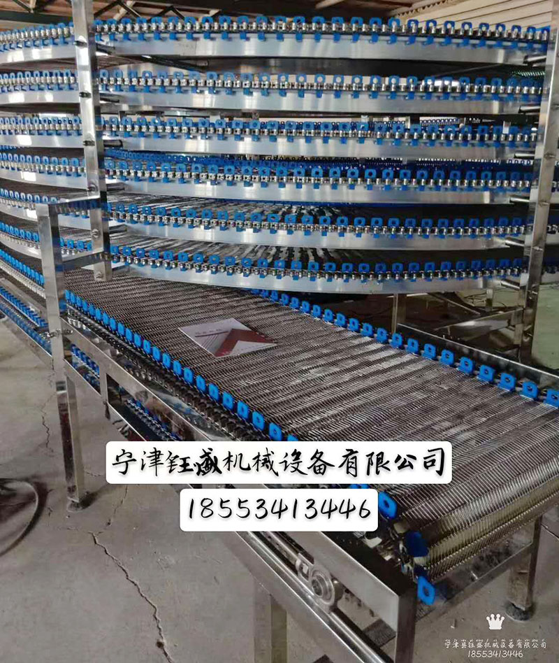 螺旋冷卻塔是一種常用的連續(xù)性輸送機(jī)械,它是利用工作構(gòu)件即螺旋體的旋轉(zhuǎn)運(yùn)動(dòng)使物料向前運(yùn)送,是現(xiàn)代化生產(chǎn)和運(yùn)輸不可缺少的重要機(jī)械設(shè)備之一!螺旋冷卻塔的優(yōu)點(diǎn):占地面積小,結(jié)構(gòu)簡(jiǎn)單、合理。 動(dòng)力消耗小,料槽磨損小 維修方便 冷卻效率高 ,傳送暢順、雜音少、低能耗、保養(yǎng)簡(jiǎn)單、快速、安全。螺旋冷卻塔應(yīng)用范圍:適用于冷卻漢堡,法式小面包,毛毛蟲(chóng),面包等產(chǎn)量較大,冷卻時(shí)間較長(zhǎng)的品種,采用不銹鋼螺旋式冷卻輸送帶,PLC智能控制。在功能不變,結(jié)構(gòu)的變化帶來(lái)成本的變化,最終帶來(lái)了利潤(rùn)的變化,使中小型食品廠買的起,用的起。螺旋冷卻塔選用不銹鋼螺旋網(wǎng)帶載體,網(wǎng)帶寬度300-900mm,層間距及層數(shù)依產(chǎn)量定制,冷卻時(shí)間20-120分鐘.冷卻產(chǎn)量大,可直接冷卻漢堡,吐司,甜面包,也可帶盤冷卻月餅,奶香包等.定制靈活,依據(jù)場(chǎng)地和產(chǎn)能設(shè)計(jì)直徑和網(wǎng)帶.單塔為上進(jìn)下出或下進(jìn)上出.雙塔為下進(jìn)下出.我廠可根據(jù)用戶的產(chǎn)量身訂做,打造經(jīng)濟(jì)實(shí)惠的非標(biāo)螺旋冷卻塔,可大大提高生產(chǎn)效率。
